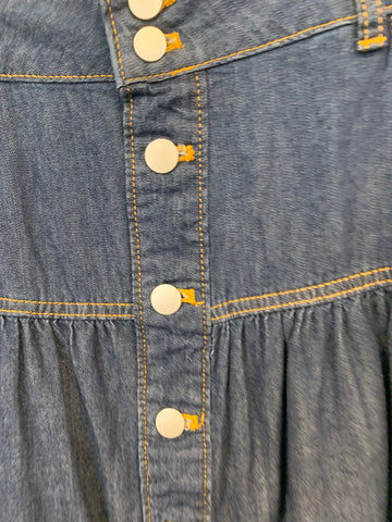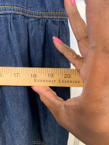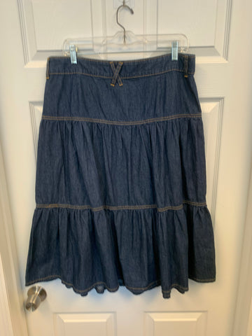 Ladies super cute medium stonewash denim button don layered ruffled vintage look denim cowgirl style skirt. Excellent condition. Ladies size 14.