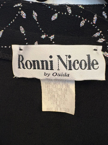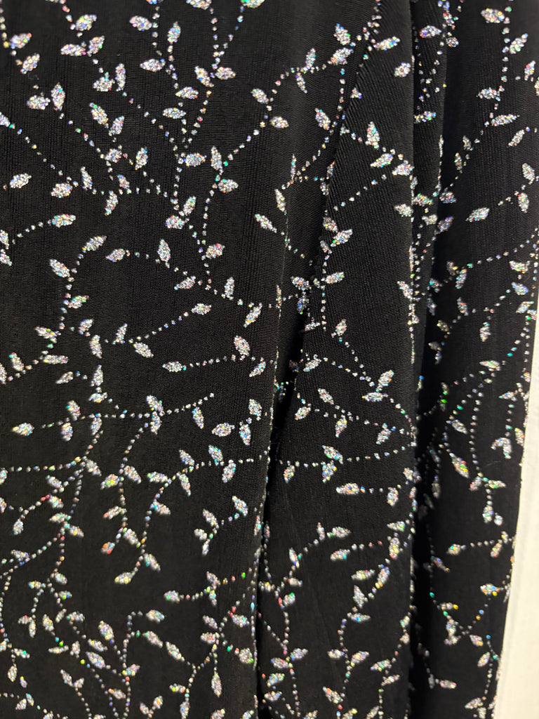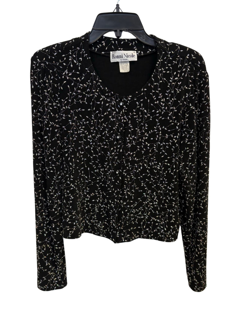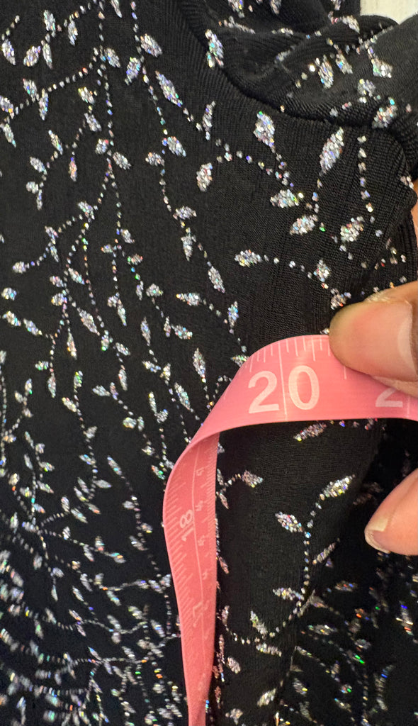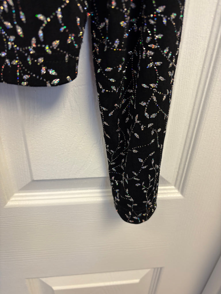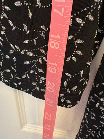 Ladies super cute black and silver metallic floral patterned vintage cardigan style top. Excellent vintage condition. Ladies size Medium. Material is stretchy. Chest 21"Length 21"