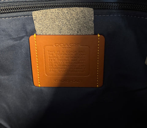 It is crafted from Coach's Signature denim and refined calf leather. The denim is made with certified organic cotton from farms using regenerative agricultural practices, highlighting Coach's commitment to sustainability.