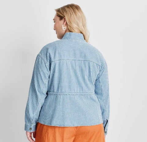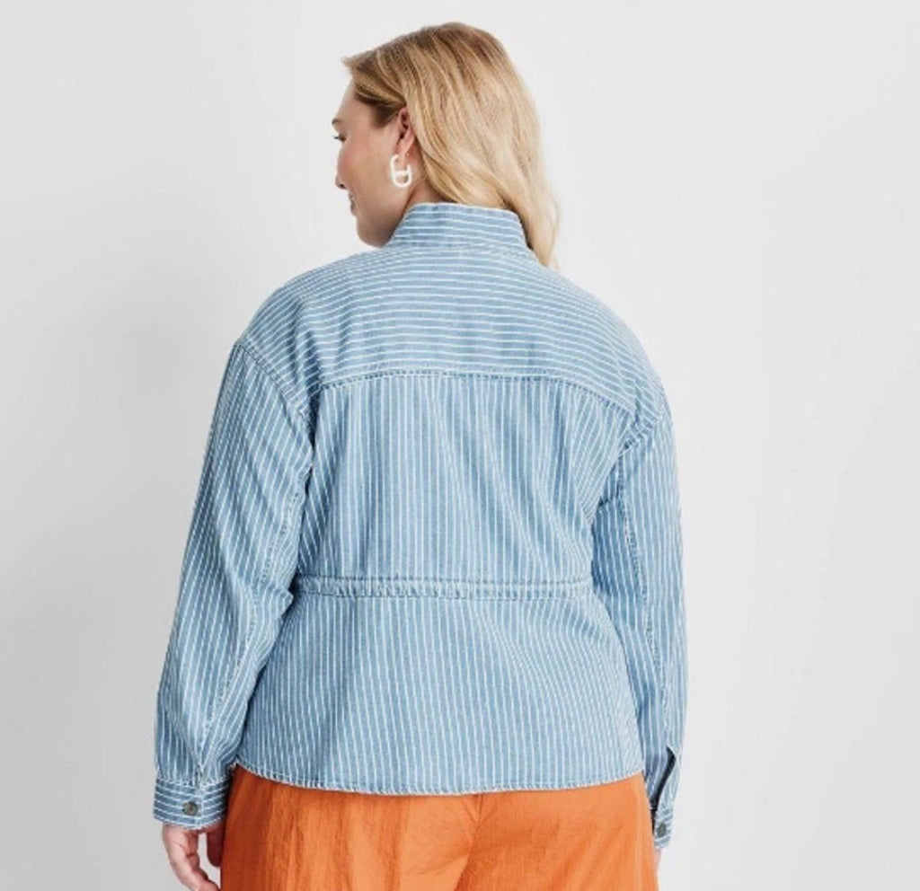Ladies super cute blue and white striped full zip denim jacket by The Future Collective. Excellent condition. Ladies size 2X.