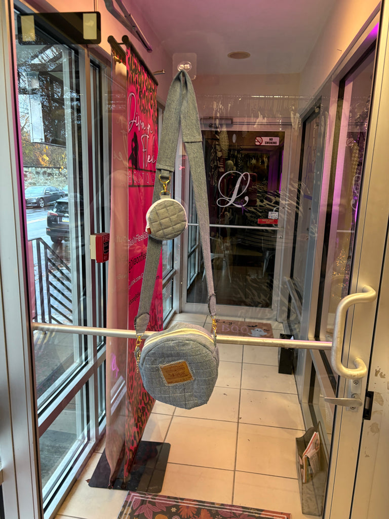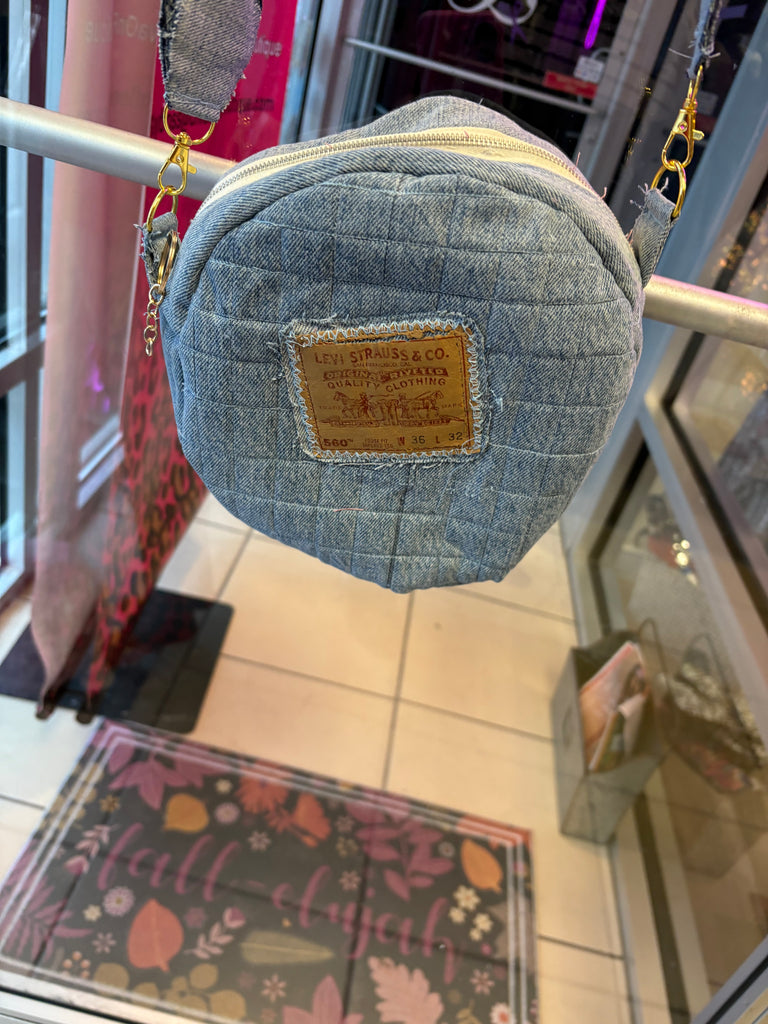 Ladies super Cute light stonewash denim quilted round crossbody bag handmade from vintage Levi's Jeans. Excellent condition. Features detachable shoulder strap, and detachable coin purse.
