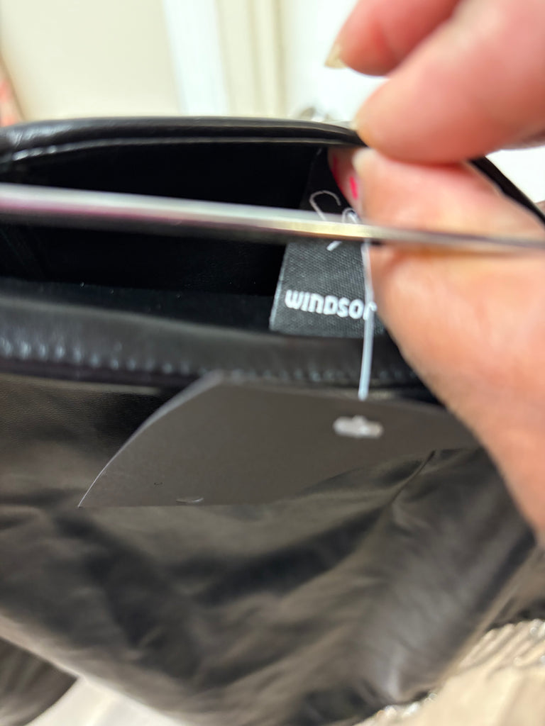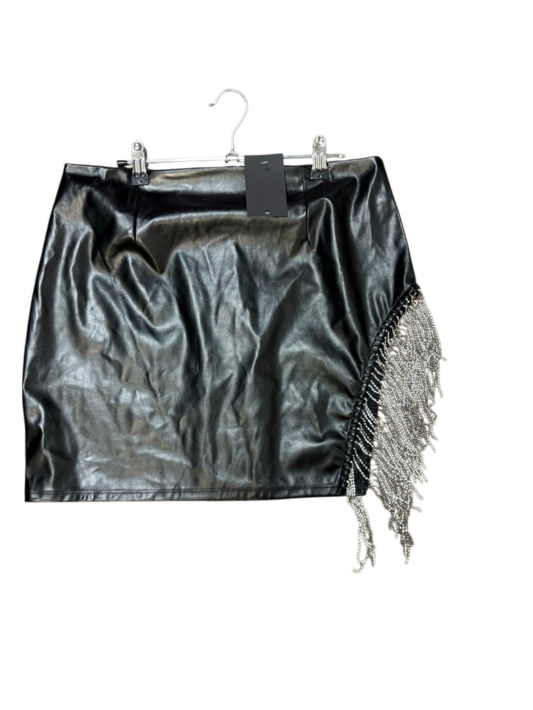 Ladies super cute black vegan leather rhinestone fringe detail skirt by Windsor. Excellent condition. Ladies size large. Material is stretchy.