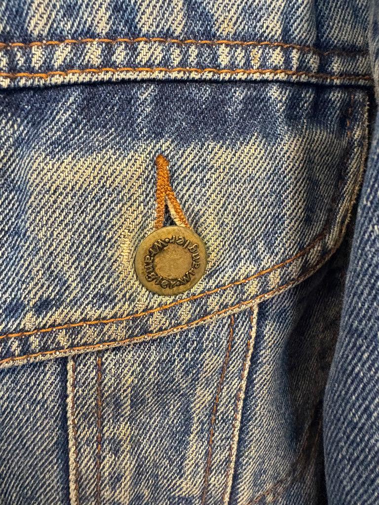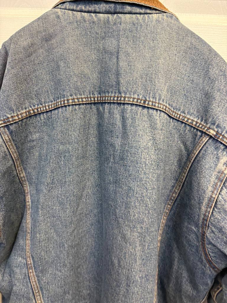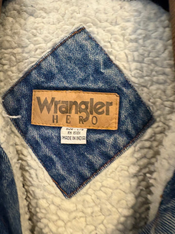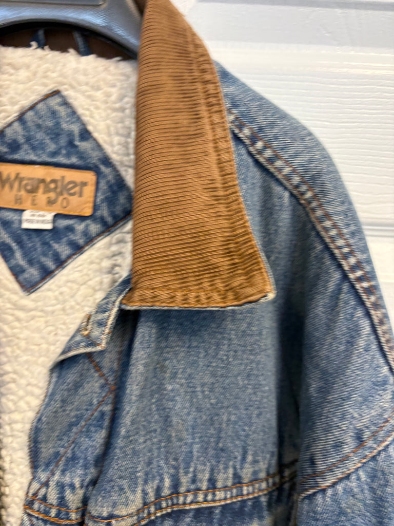 Men's medium stonewash denim vintage corduroyCollared fleece lined denim button down jacket by Wrangler Hero. Excellent vintage condition. Men's size large. Chest 24"Length 30"