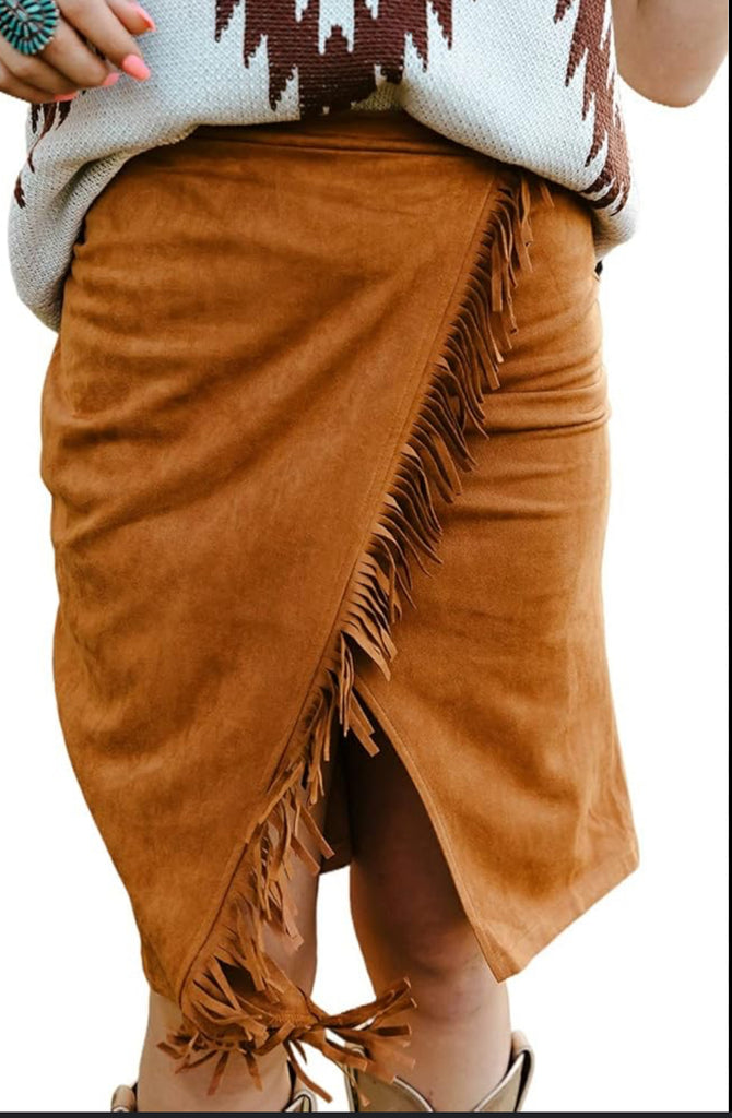 Ladies super cute tan colored asymmetrical fringe detail faux suede skirt. Excellent condition. Ladies size XL.
